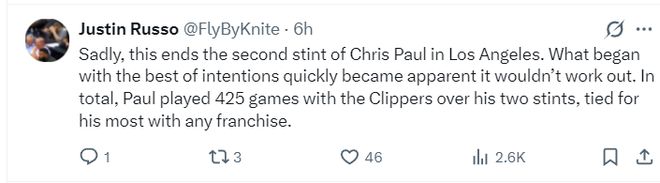 这笔交易发生后,快船记者Justin Russo写道:保罗在快船的生涯就此终结,令人遗憾。起初双方都希望朝着理想的方向发展,但很快彰显出矛盾无法延续下去。保罗职业生涯为快船出战425场比赛,这一数字是他效力过的任何球队中最高纪录。