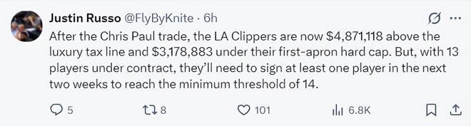 跟对于快船来说送走保罗利好太多了,保罗的交易完成后,快船的总薪资超出奢侈税线美元,快船目前保障名单只有13份,球队需要在两周内签下一人满足联盟最低14份保障名单的最低门槛。