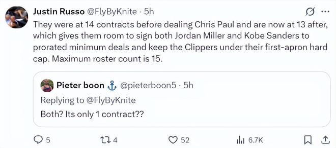 快船队一直有意将桑德斯、乔丹米勒两位双向合同球员的合同转为正式合同,送走保罗后大名单只剩下13人正好可以转正这两位出色的年轻小将。而且乔丹-米勒、科比-桑德斯两人的合同会转为最低的新秀合同,这样快船可以保持在第一奢侈税征点之内。